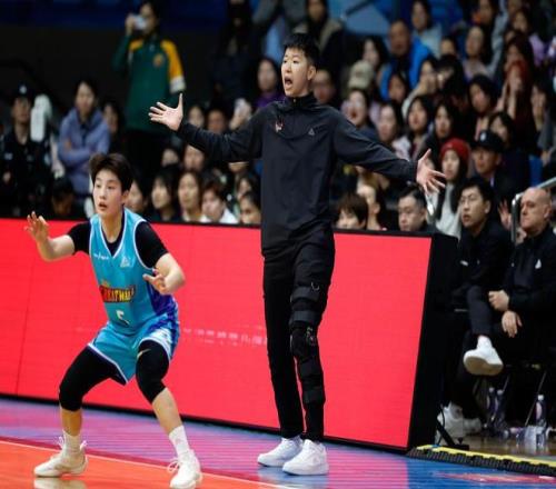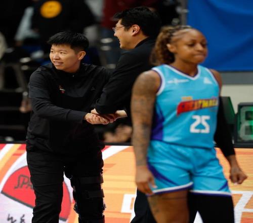 1月20日,广东东莞新彤盛队主教练兼球员黄思静(左一)与球员兼助理教练杨力维(左二)等上场球员致意。新华社记者 王丽莉 摄