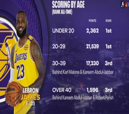 詹姆斯各个年龄段得分排名: